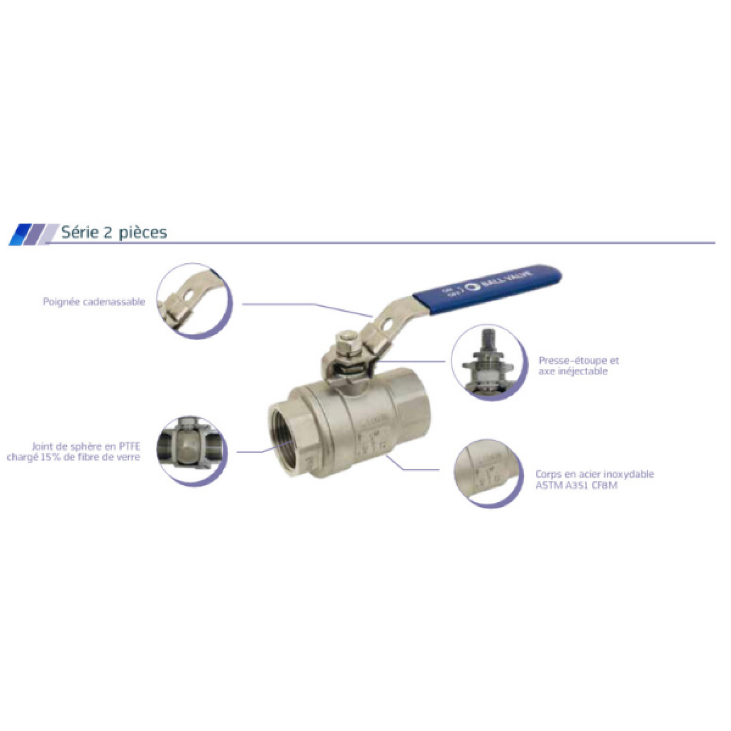 Vanne À Sphère Inox 2 Pièces Mâle x Femelle - Passage Intégral - Poignée Plate Bleue